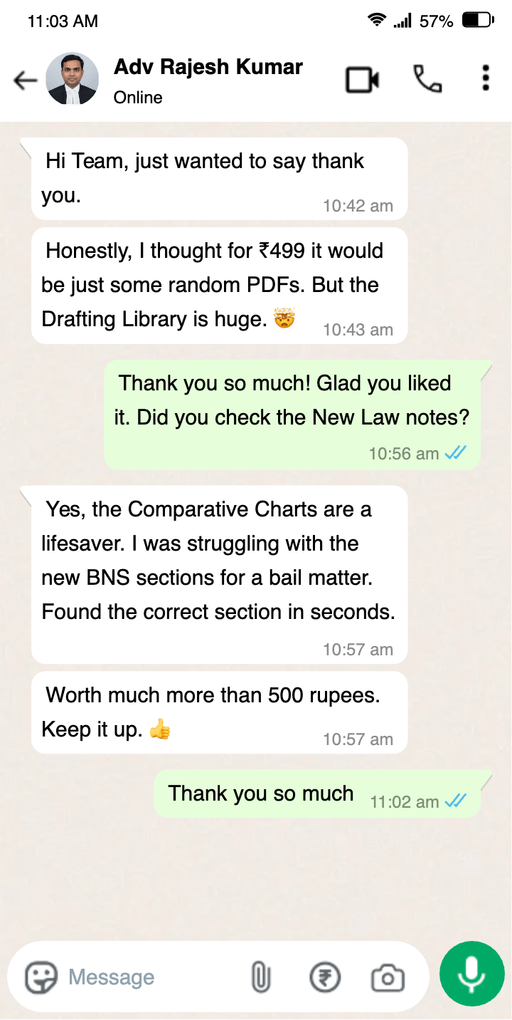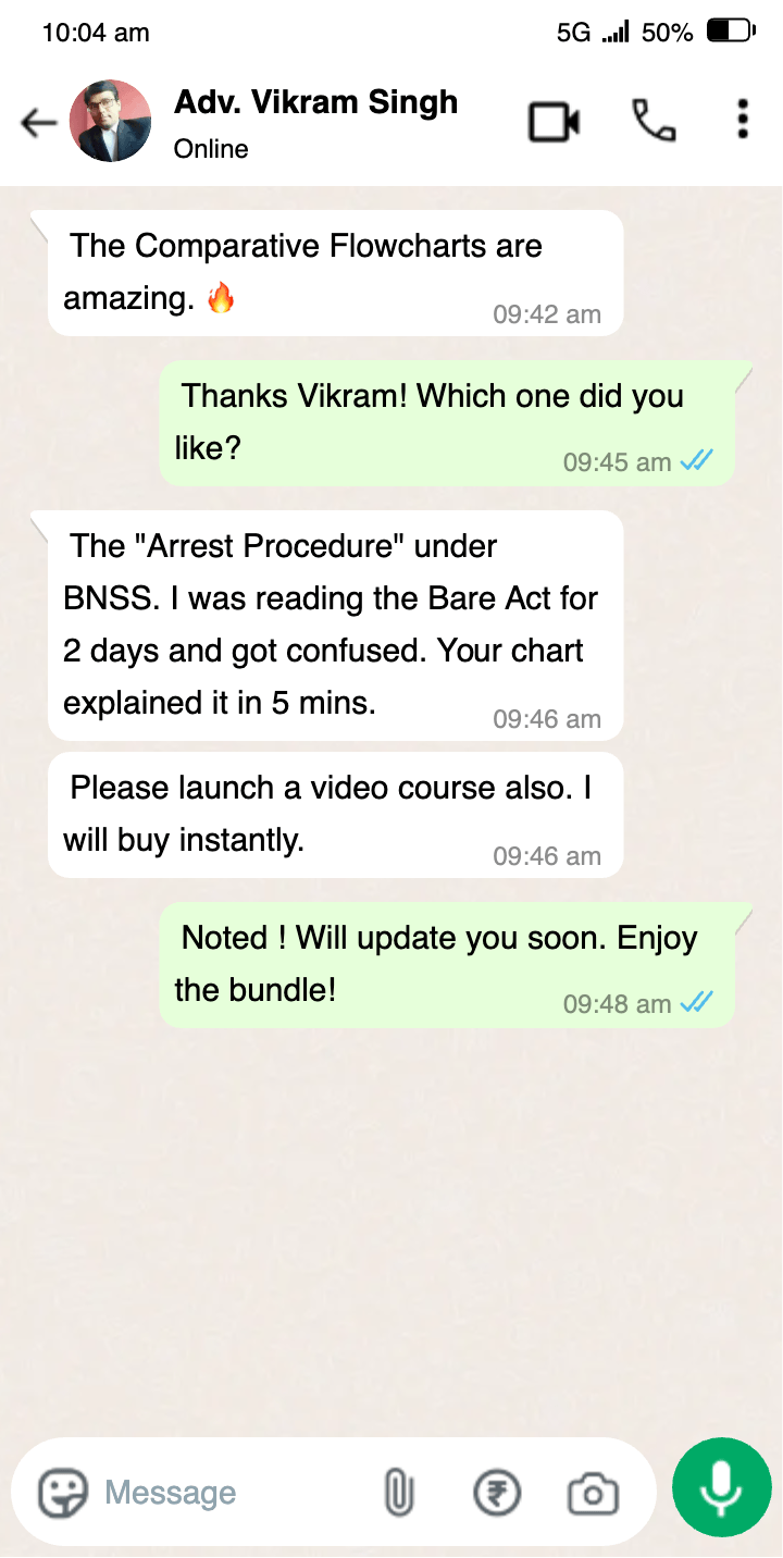"The Comparative Charts are worth the price alone." "I was struggling to find the corresponding sections for a cheating case under the new BNS. The comparison chart in this saved me hours of research. Honestly, I would have paid ₹2000 just for that one PDF."
