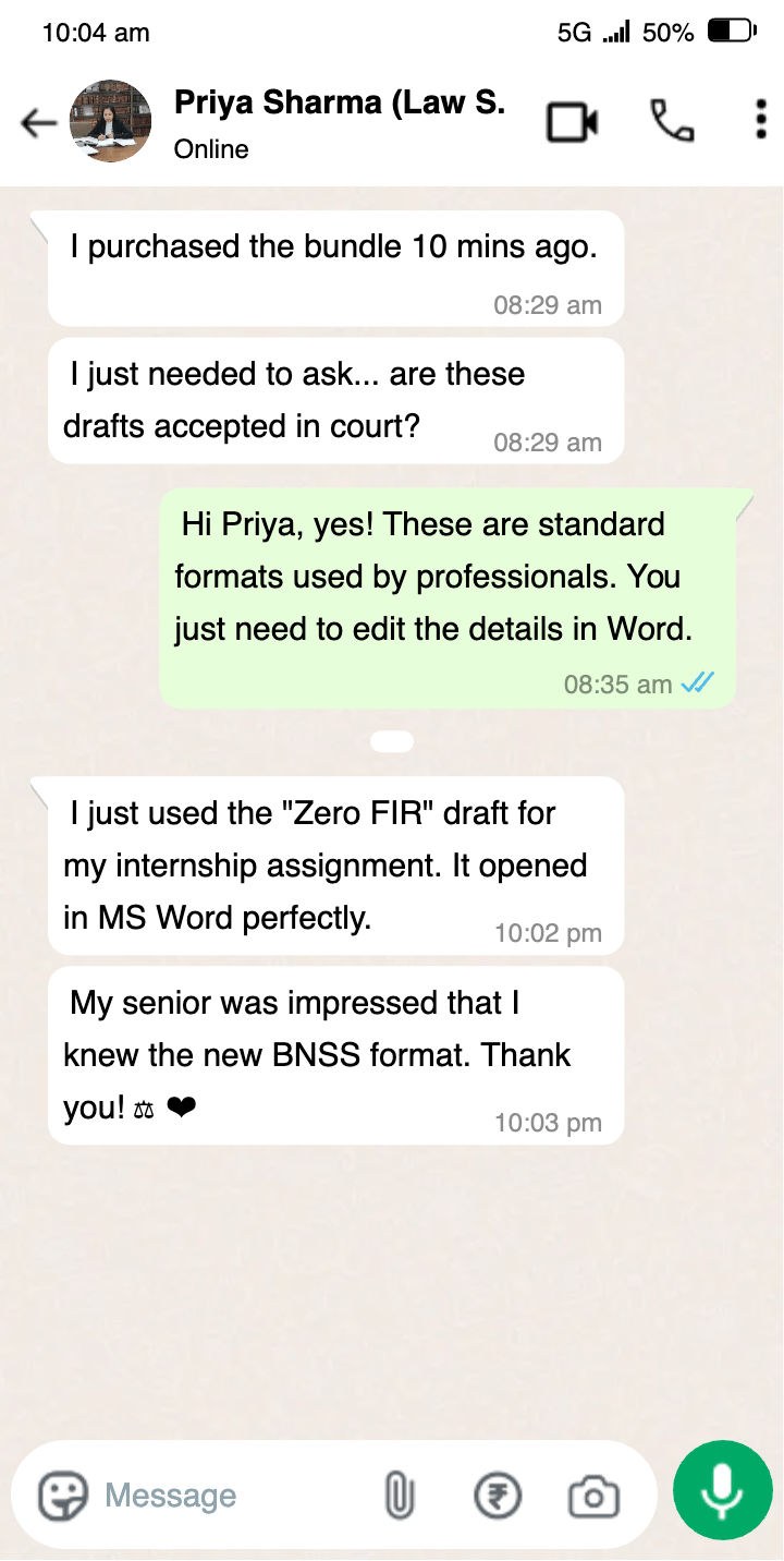 "I started my internship last week and was asked to draft a Rent Agreement. I used the template from this pack, and my senior didn't make a single correction. Best ₹499 investment for a law student."